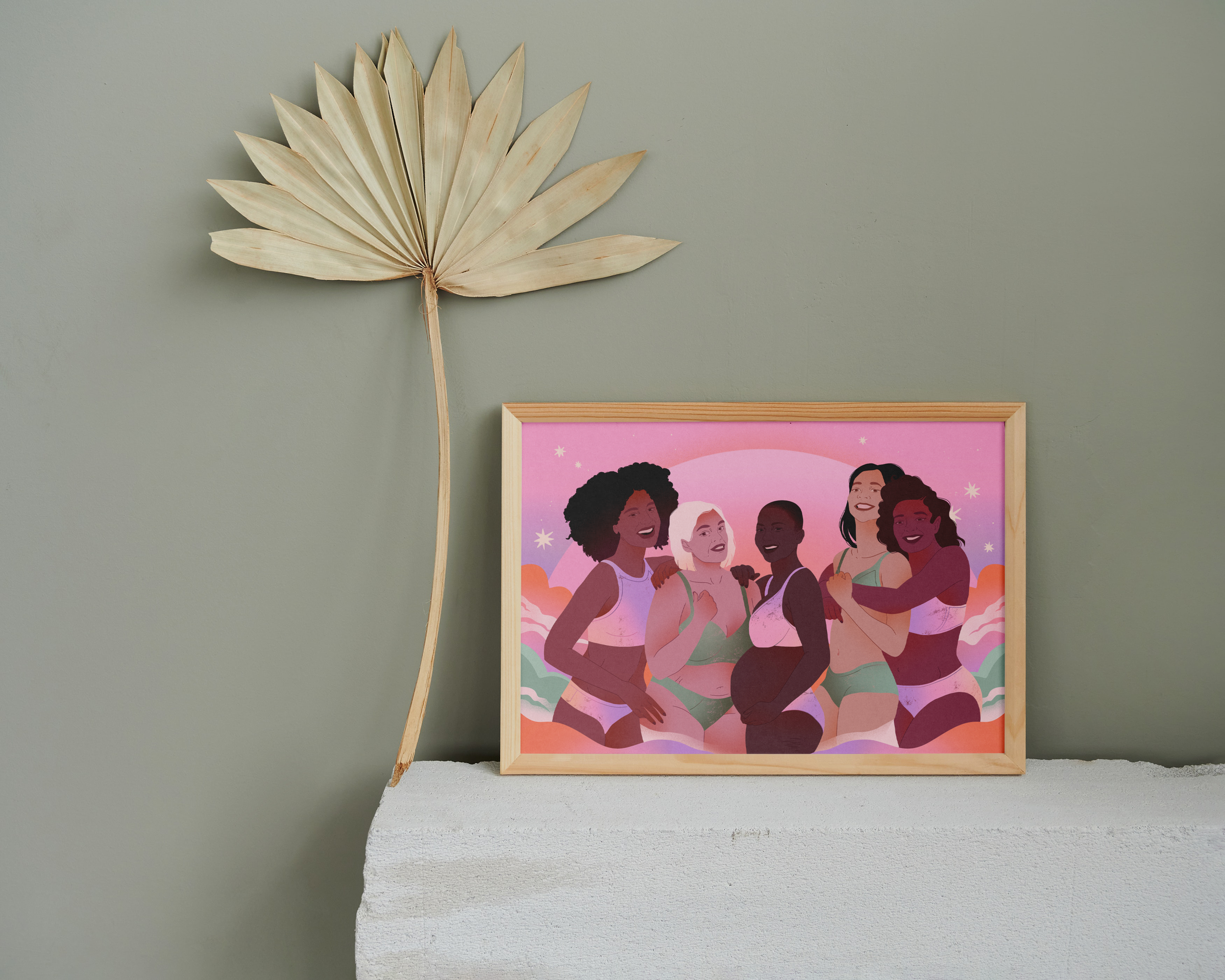 ☞ Conception d’une illustration centrale célébrant la sororité et la diversité des corps, afin que chaque patiente se sente représentée et accueillie.